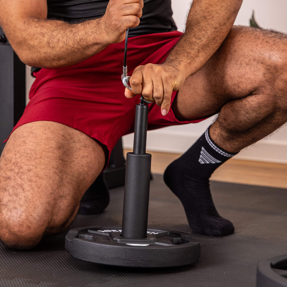 La broche de chargement Ø 25 mm est compatible avec tous les disques classiques, et l'extension Ø 50 mm te permet d'utiliser aussi des disques olympiques.