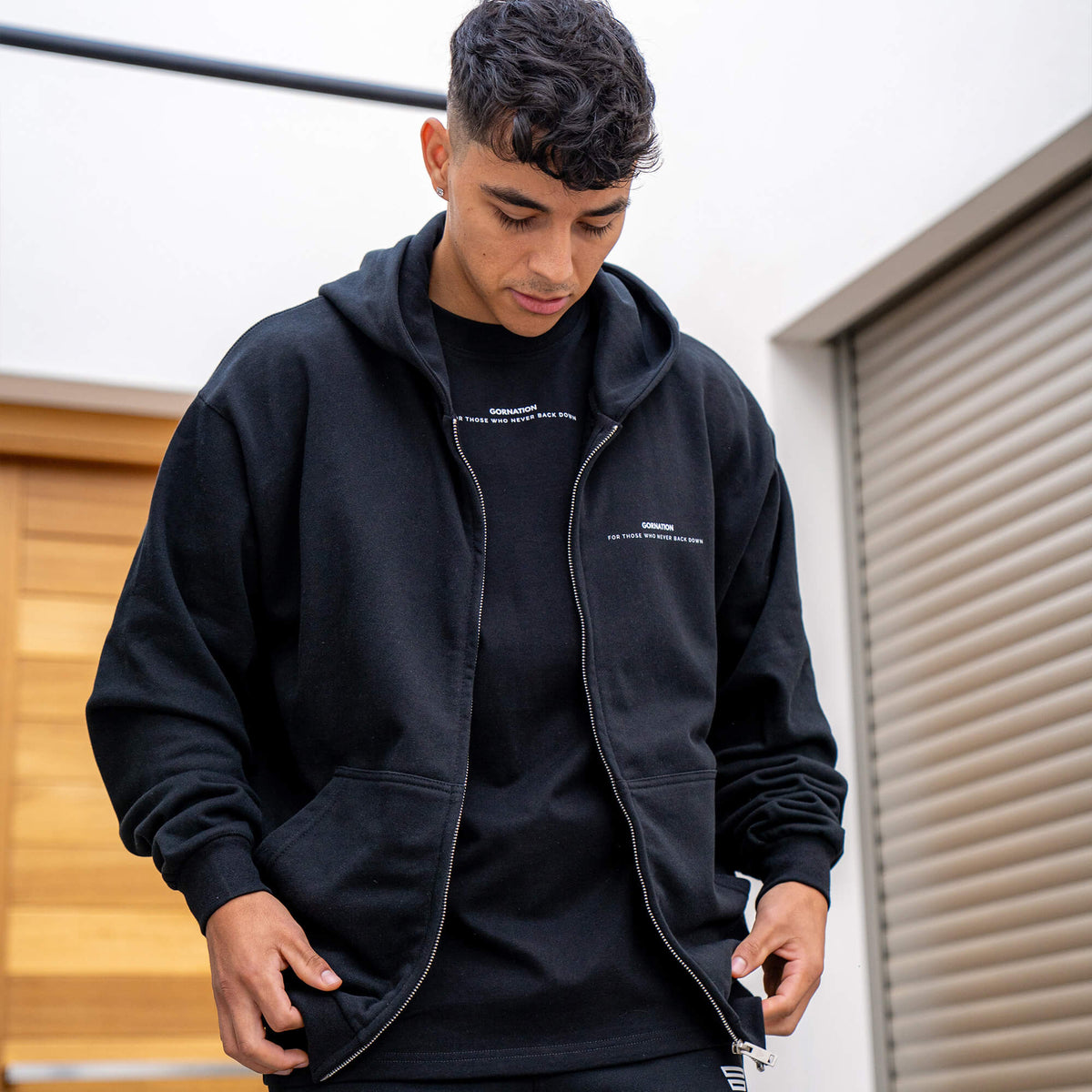 A modern streetwear jacket inspired by the anime motifs Balance, Control, and Strength.