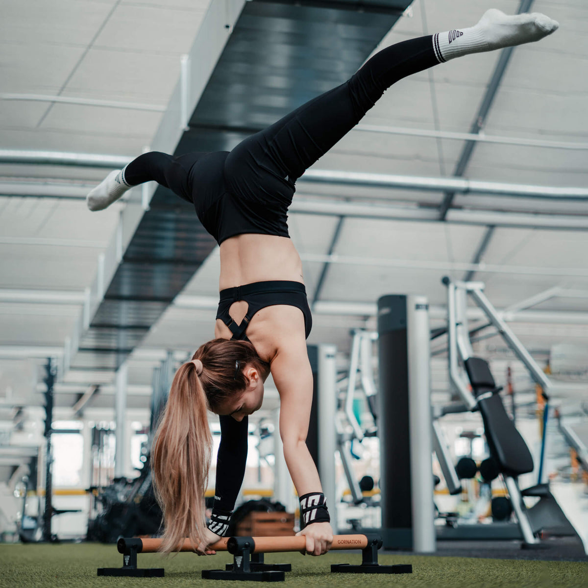 The Parallettes Pro, due to their stability and low height, are suitable for all exercises that you would normally do on the floor, such as handstands, push-ups or planches. The advantage here is that the wrist is relieved and more control & balance can be exercised due to the wooden handles.