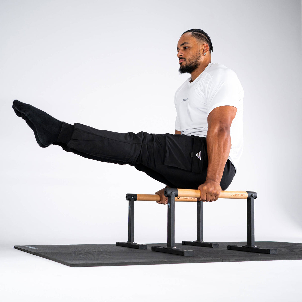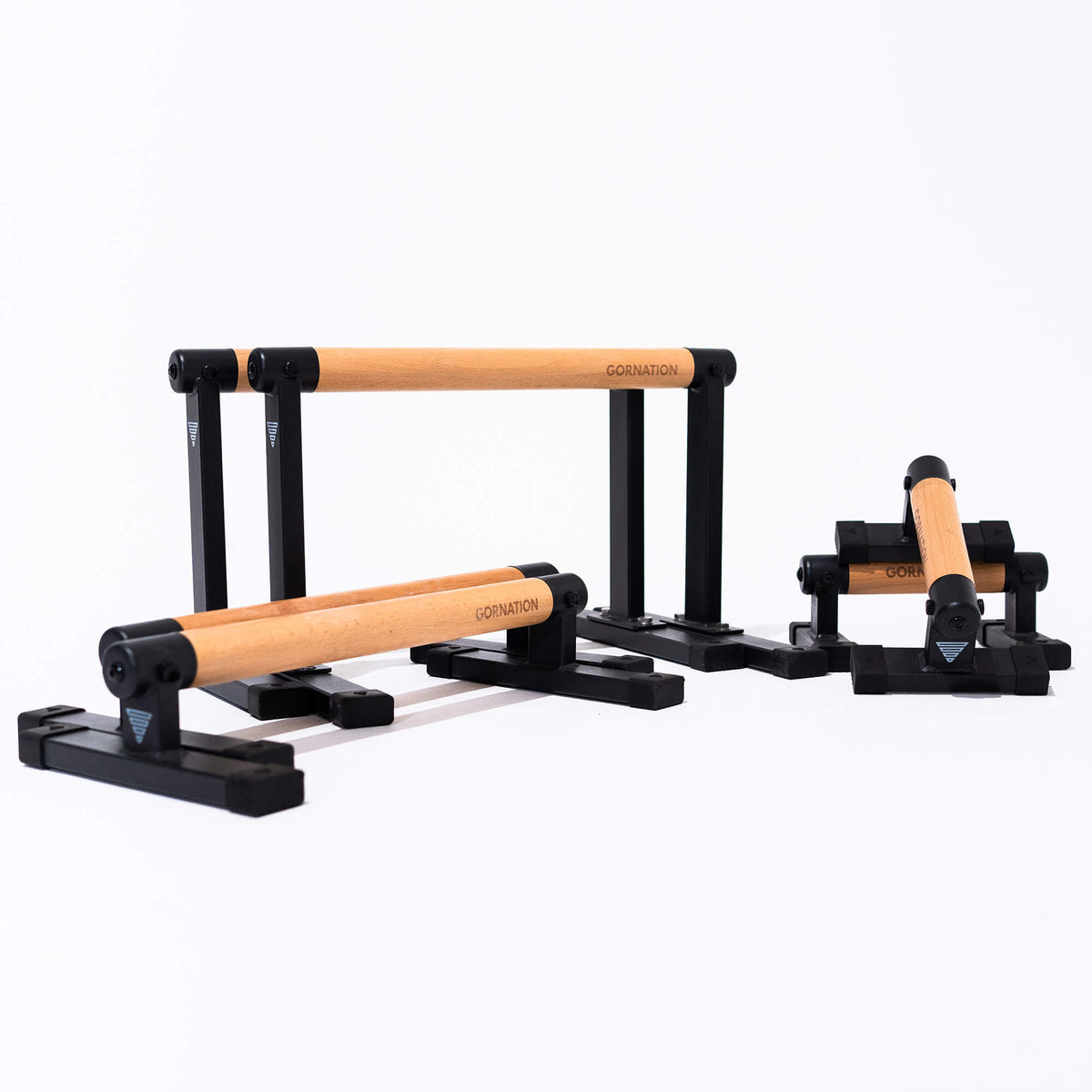 Our Premium Parallettes Set by GORNATION combines the three most popular parallettes variants in one bundle: the Premium Parallettes Max, Pro, and Active. This set offers you maximum flexibility and versatility for your calisthenics and street workout training. Whether you are a beginner or a pro, with this set you are perfectly equipped for every exercise.