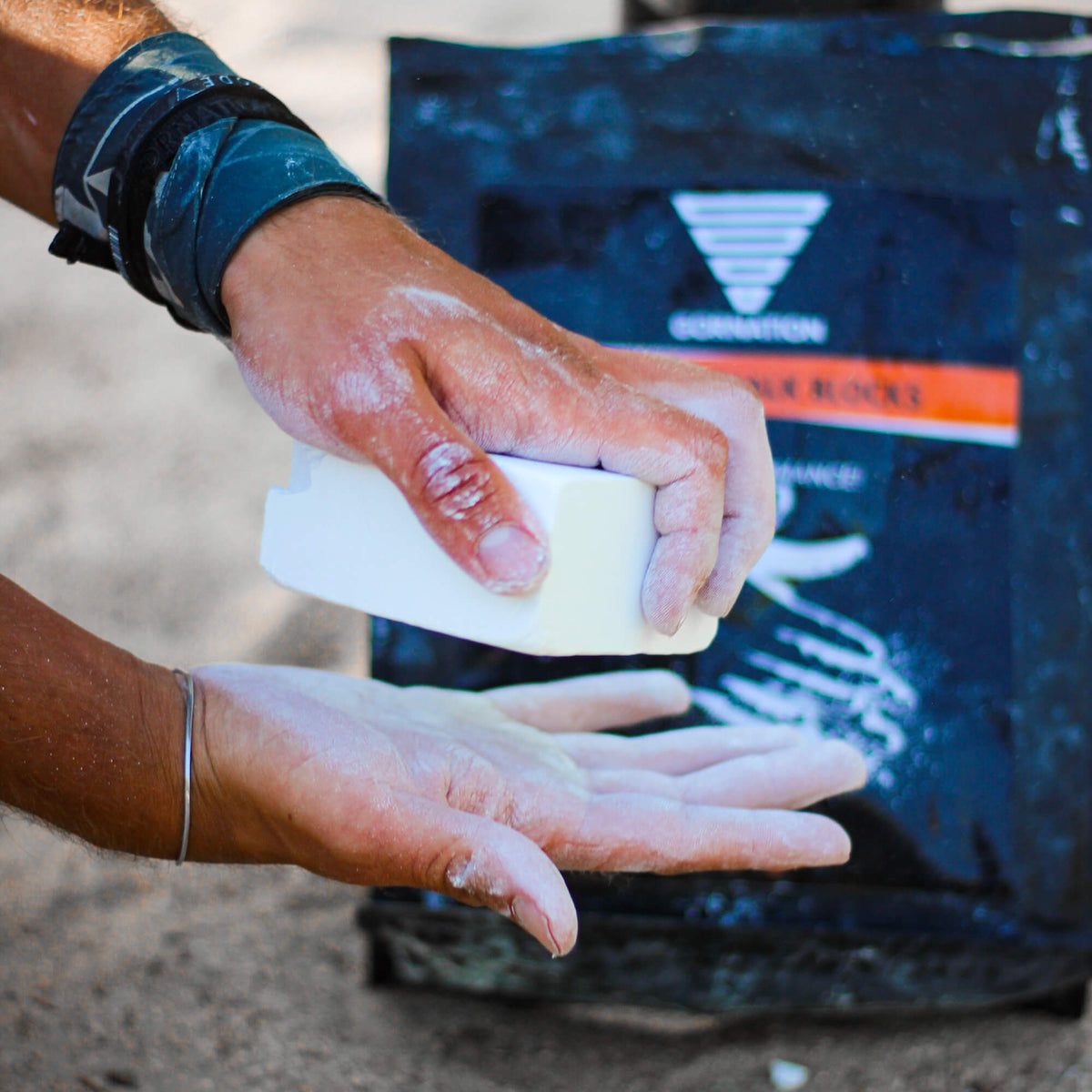 Chalk Blocks are pressed cubes of magnesia powder. Powder Chalk is fine magnesia powder. Liquid Chalk is chalk liquefied with a special formula that can be applied to the hands like a cream.