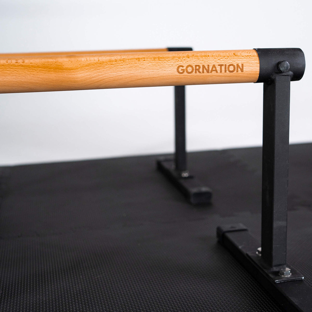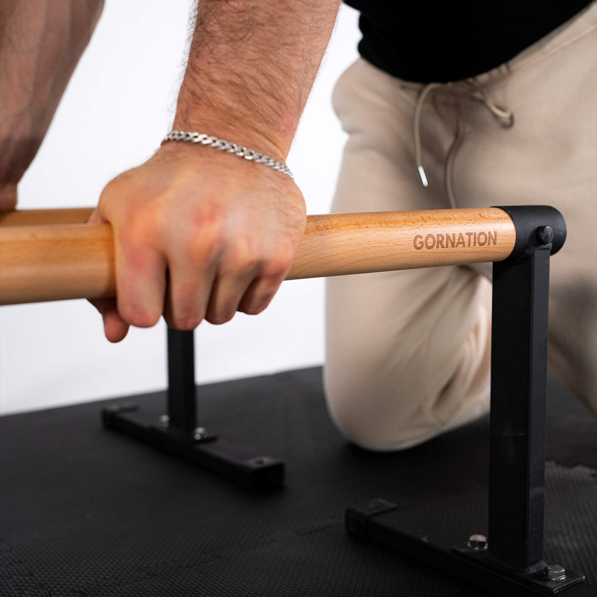 Our calisthenics tools are characterized by their high-quality workmanship and high level of safety. GORNATION's bars with wooden handles made of beech wood offer a comfortable grip and absorb moisture, which is essential for safe exercise performance. The high parallettes are lightweight and compact, making them ideal for training at home in the home gym, in the gym, or outdoors for outdoor workouts. Their robust construction made of beech wood and steel ensures stability and safety during training.