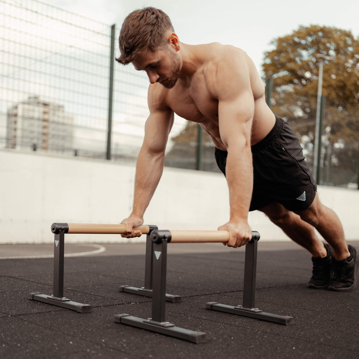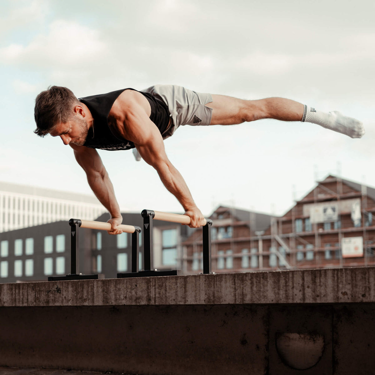The Parallettes Max offer the greatest variety of exercises among the Premium Parallettes due to their 30cm height. Exercises for all levels & body groups can be performed on the Parallettes, such as push-ups, handstands, L-sits, planches and more.